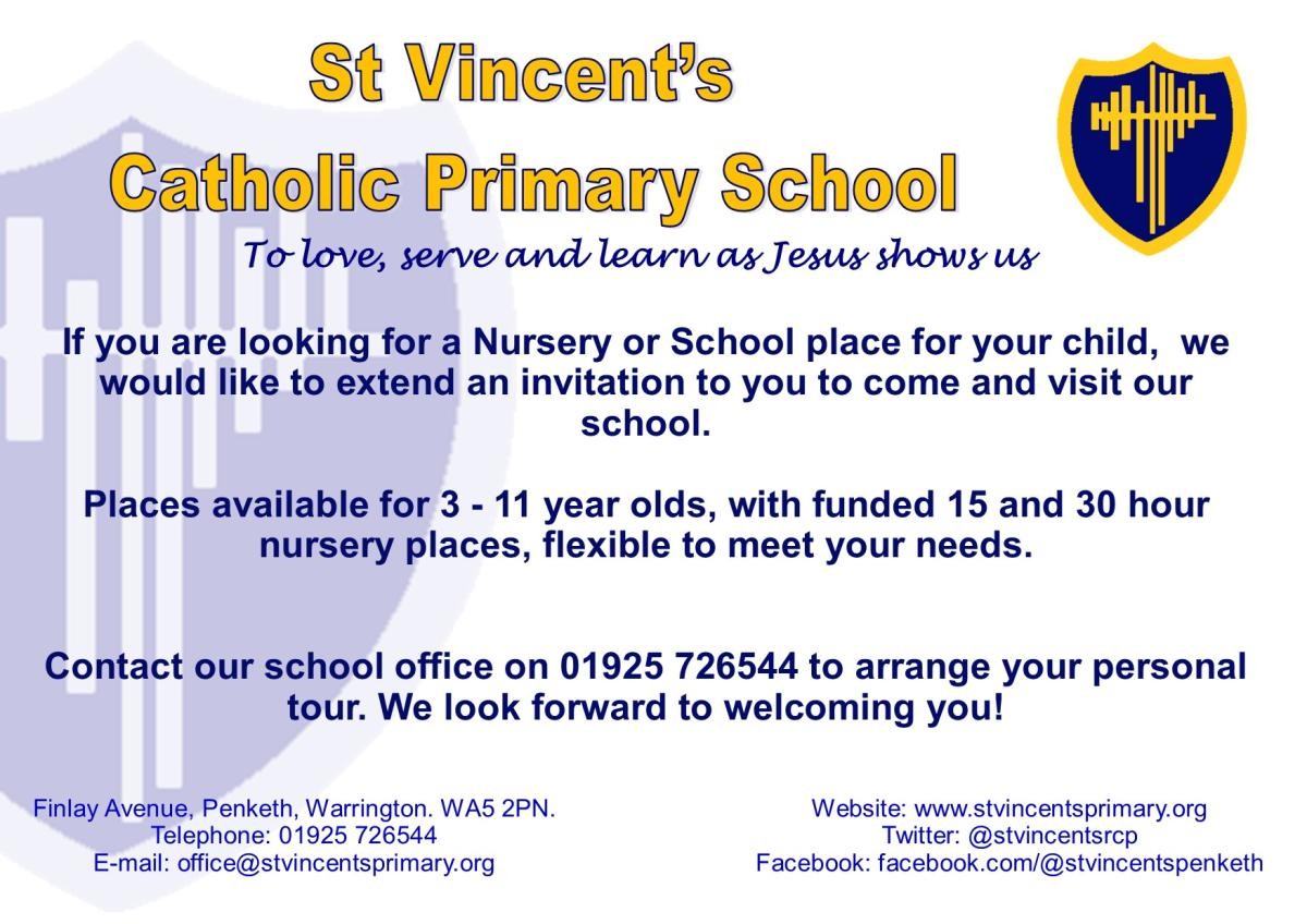 School leaflet.pdf St Vincent's CPS Admissions Policy 2027-2028.pdf St Vincent's Supplementary Information Form 2027-2028.pdf St Vincent's CPS Admissions Policy 2026-2027.pdf St Vincent's Supplementary Information Form 2026-2027.pdf Admissions Policy and Arrangements- 2025-2026.pdf For more information on the admissions process (including appeals) or to complete your application for a place at St Vincent's Catholic Primary School, please follow the link below: https://www.warrington.gov.uk/primary-school-admissions