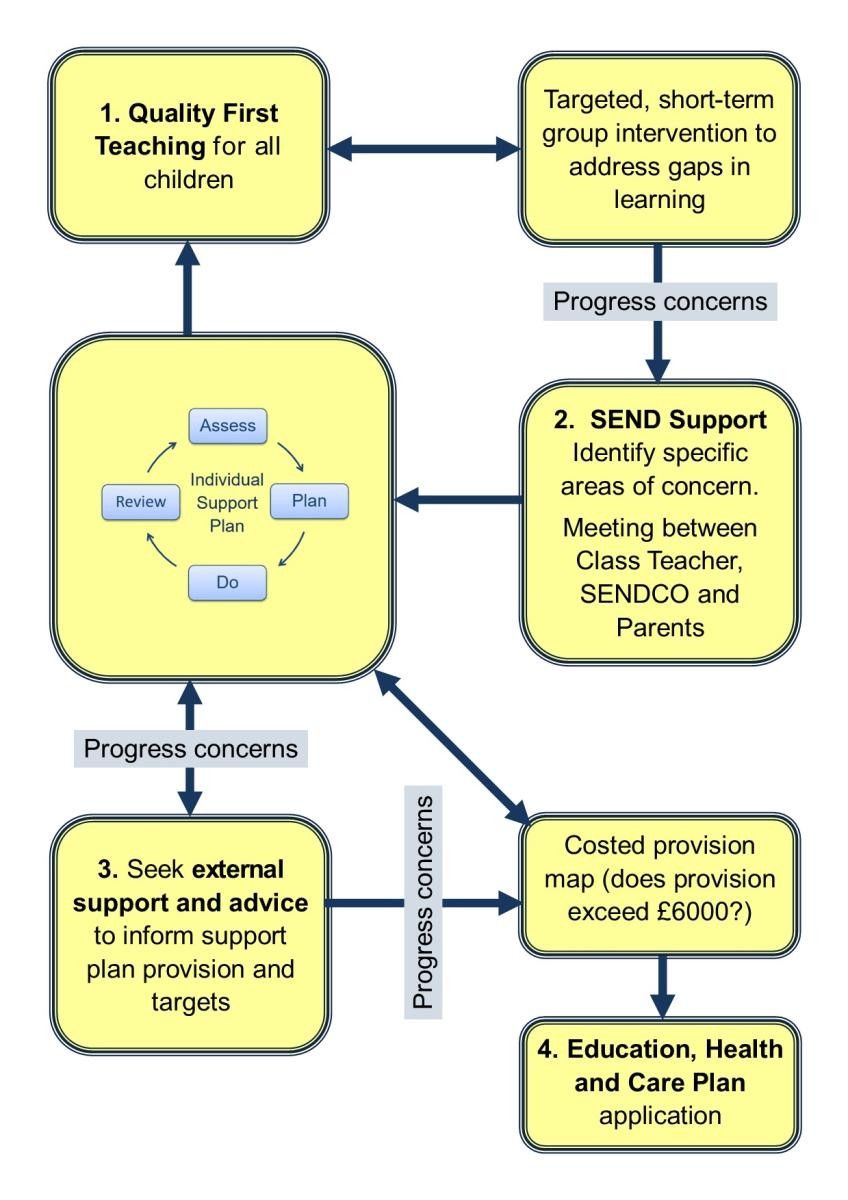 If you wish to discuss concerns about your child's progress or development, please speak to your child's class teacher in the first instance. You may also contact Miss Flynn, our SENDCO, via the school office on 01925 726544 or via email: senco@stvincentsprimary.org